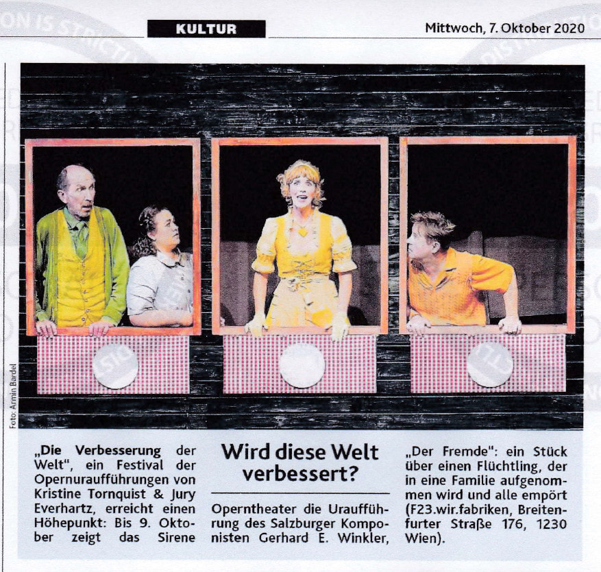 Zeitgenössische Oper ist oft keine leichte Kost. Wobei die Leichtigkeit generell alles andere als leicht ist. Es erfordert schon einiges an Mut zeitgenössische Opernproduktionen auf die Bühne zu bringen. Das sirene Operntheater hat diesen Mut aufgebracht und will dann auch noch die Welt ein Stück besser machen. Die gute Nachricht zuerst: das ist den Künstlern rund um Kristine Tornquist und Jury Everhartz auch gelungen. Das Vorhaben gleicht einer Herkulesaufgabe: 7 Uraufführungen zeitgenössischer Opern im Abstand von jeweils nur 2 Wochen. Die 7 Produktionen sind allesamt Auftragswerke und bringen Leichtigkeit in die Welt, Atonalität, ohne auch nur die geringsten Abstriche bei künstlerischen Ansprüchen. Es folgen noch einige Uraufführungen, die in Wien-Atzgersdorf zu besuchen sehr empfehlenswert ist. "Jedermann", Internet