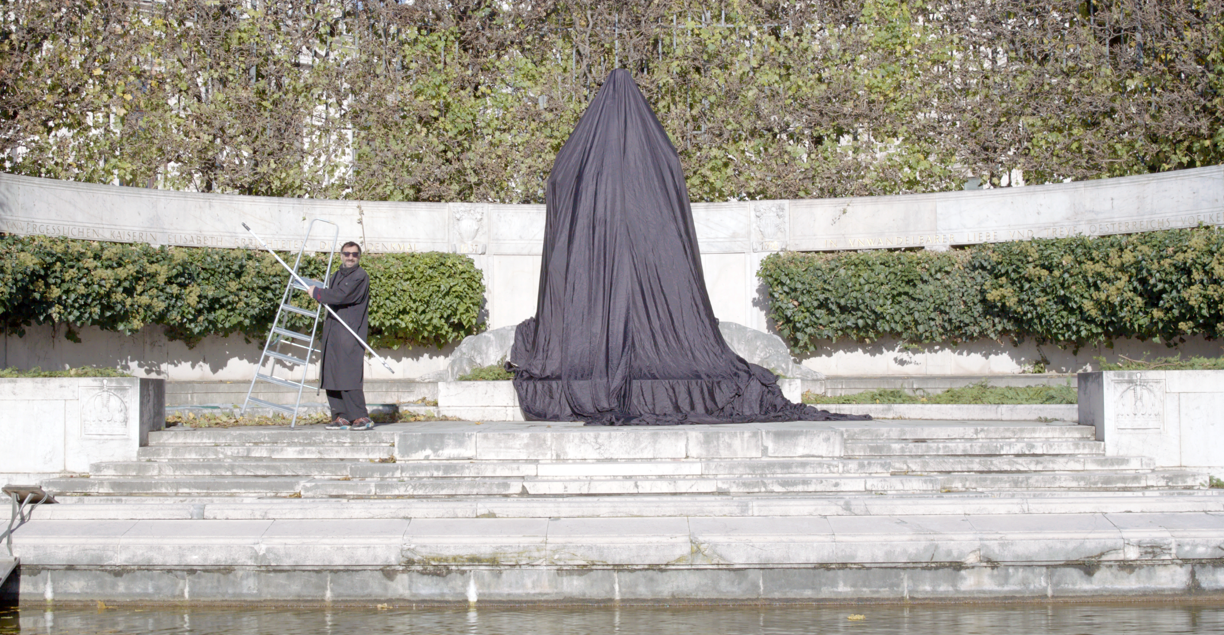 Folgeprojekt 2025: *** Installation von Michael Podgorac (Mikal Maldoror) mit dem schwarzen Vorhang aus Habotai Seide von Burkert/Tornquist (Sisi-Denkmal im Wiener Volksgarten)